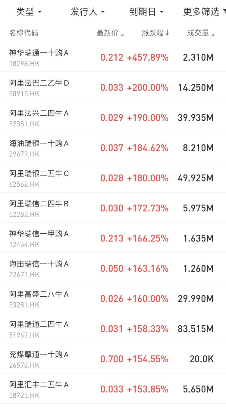 涨幅居前的包括:$18298.HK神华瑞通一十购A狂涨457.89%,$50915.HK阿里法巴二乙牛D涨200%,$09988.HK阿里巴巴今日大涨6.34%,共有14只牛证涨超100%!(含100%)。