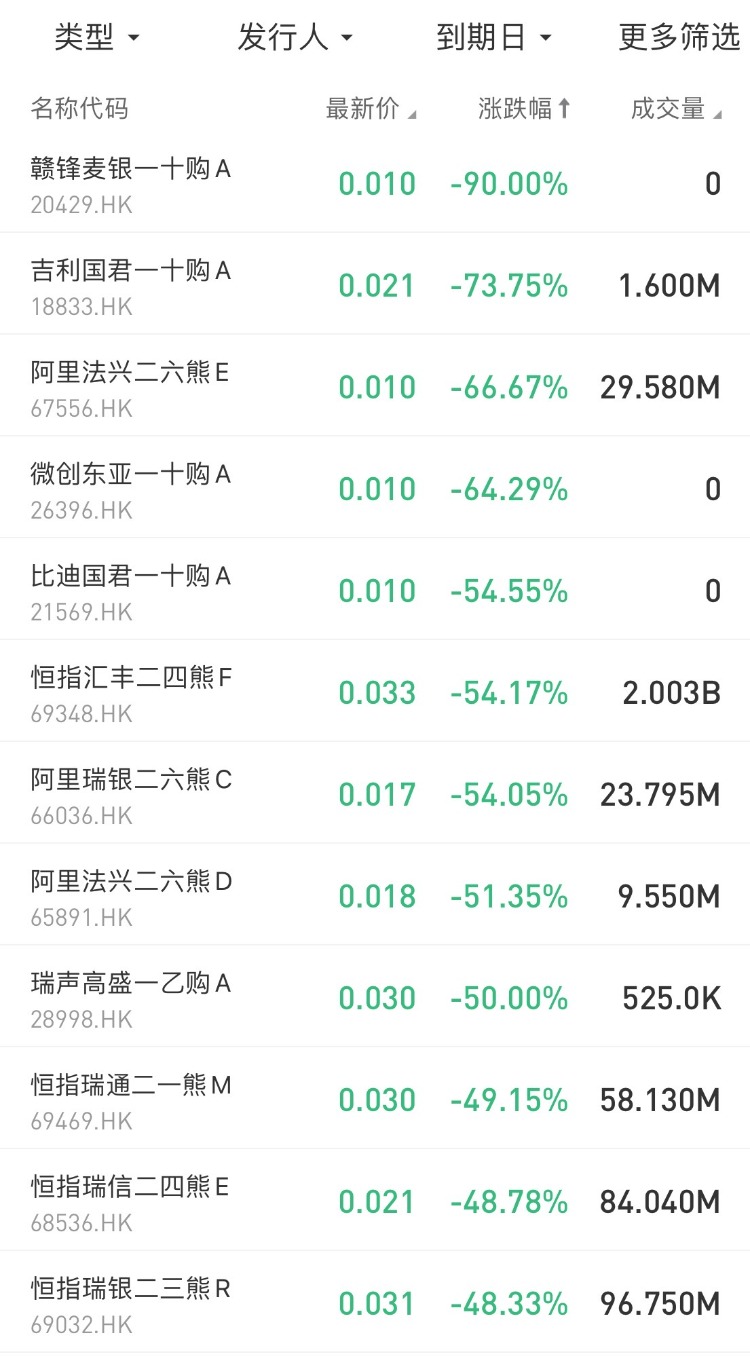 在今日跌幅榜中,$18833.HK吉利国君一十购A跌73.75%,$67556.HK阿里法兴二六熊E跌66.67%。
