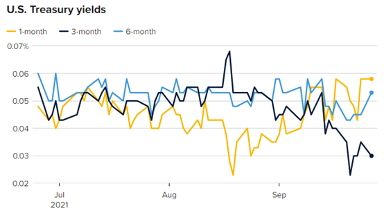 美国股市基本上忽略了政府可能关门的风险,但在短期国债市场,1个月期国债收益率略高于3个月期国债收益率。Clifton称,收益率走势与价格走势相反,投资者认为10月底到期的国债风险更大。1个月期的国债收益率为0.06%,而3个月的收益率则为0.03%。