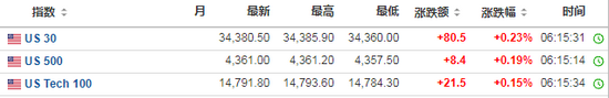 道琼斯工业平均指数期货上涨 80 点,或 0.23%。标准普尔 500 指数和纳斯达克 100 指数期货分别上涨 0.19% 和 0.15%。