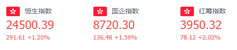 截至周二收盘,截至收盘,恒生指数涨291.61点或1.2%,报24500.39点,全日成交额达1474.75亿。国企指数涨1.59%,报8720.3点,红筹指数涨2.02,报3950.32点。