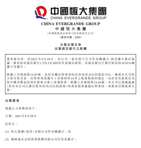 中国恒大在港交所公告称,全资子公司向沈阳盛京金控投资集团有限公司出售盛京银行17.53亿股的非流通内资股,占盛京银行已发行股份的19.93%;对价为每股人民币5.7元,合计人民币99.93亿元。