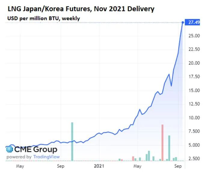 中国是仅次于日本的第二大液化天然气进口国。随着欧洲和亚洲争夺供应,11月交付至日本和韩国的液化天然气价格,在纽约商品交易所上飙升至每百万英国热单位27.45美元,高于一年前的6美元。