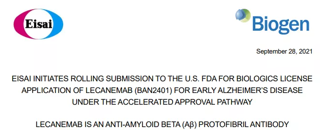 9 月 28 日,渤健/卫材共同宣布已向 FDA 滚动提交 Lecanemab(BAN2401)的上市申请(BLA),用于治疗早期阿尔茨海默病。在完成所有材料提交后,FDA 将设定 PDUFA 行动日期。