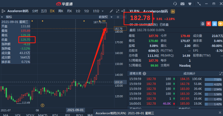 Acceleron本月内大涨40.9%,现报187.78美元,总市值达111.3亿美元。