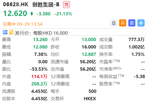 创胜集团现跌21.13%,报12.62港元,市值56.20亿港元。