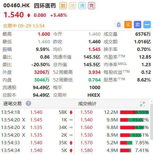 截至发稿,四环医药涨5.48%,报1.54港元,总市值达145.5亿港元。
