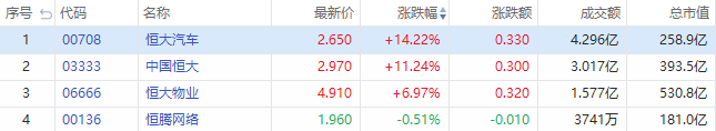 华盛资讯9月29日消息,恒大系早盘拉升。截至发稿,恒大汽车涨14.22%,股价报2.65港元;成交额4.29亿港元;中国恒大涨11.24%,报2.97港元每股,成交额3.01亿港元;恒大物业涨6.97%;恒腾网络微跌。