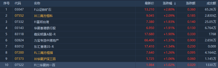 今日港股市场,涨幅居前的是F山证铁矿石 $03047.HK ,收涨2.8%;华夏香港银行股 $03143.HK 收涨1.91% 。