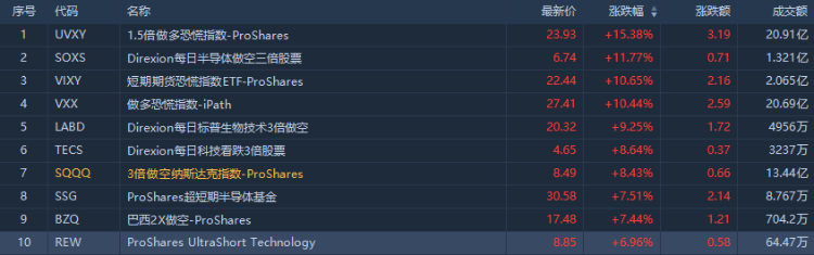 从ETF涨幅榜来看,受美股大跌影响,隔夜涨幅居首位的是1.5倍做多恐慌指数ETF $UVXY ,大涨15.38%,成交额为20.91亿美元;3倍做空纳斯达克指数ETF $SQQQ 大涨8.43%,成交13.44亿美元。