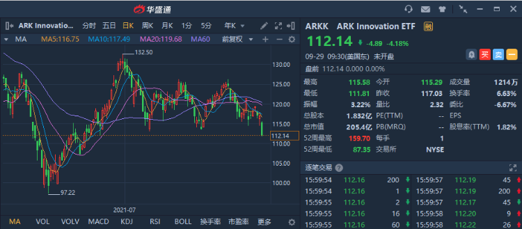 值得关注的是,随着科技股和成长股在近期美债收益率飙升背景下遭遇抛售,木头姐(Cathie Wood)旗下的ARK基金似乎又一次遭遇重创。木头姐旗下旗舰基金ARKK $ARKK 周二再度下跌了4.2%,这一跌幅要明显大于标普500指数的2%和纳斯达克指数的2.8%。在去年疫情封锁期间帮助木头姐获得巨额收益的高成长型股票,在当前却拖累ARKK的表现,使得该ETF的亏损在近几个交易日明显放大。