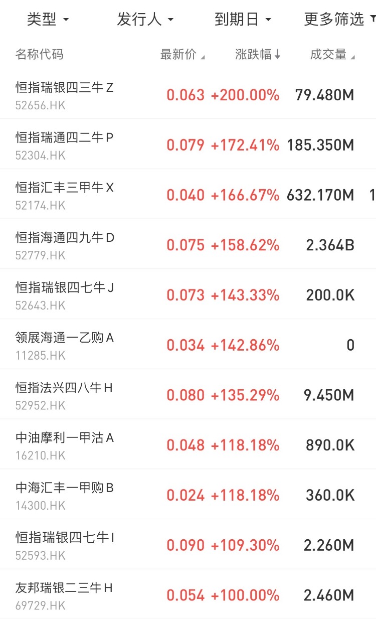 涨幅居前的包括:$52656.HK恒指瑞银四三牛Z涨200%,$HSI.HK恒生指数今日涨0.67%,共有7只恒指牛证涨超100%;$11285.HK领展海通一乙购A涨142.86%。