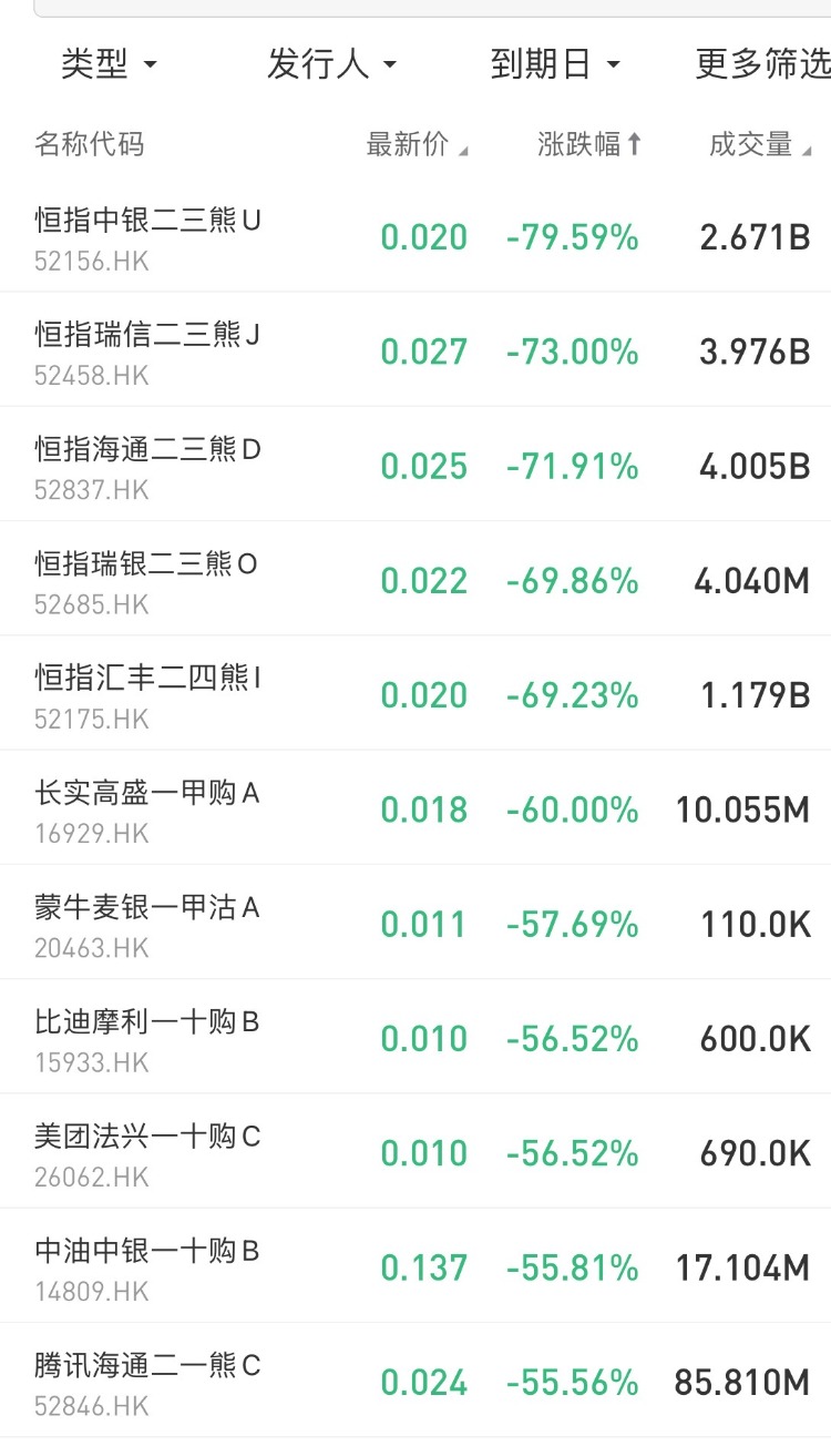 在今日跌幅榜中,$52156.HK恒指中银二三熊U跌79.59%%,$16929.HK长实高盛一甲购A跌60.00%。
