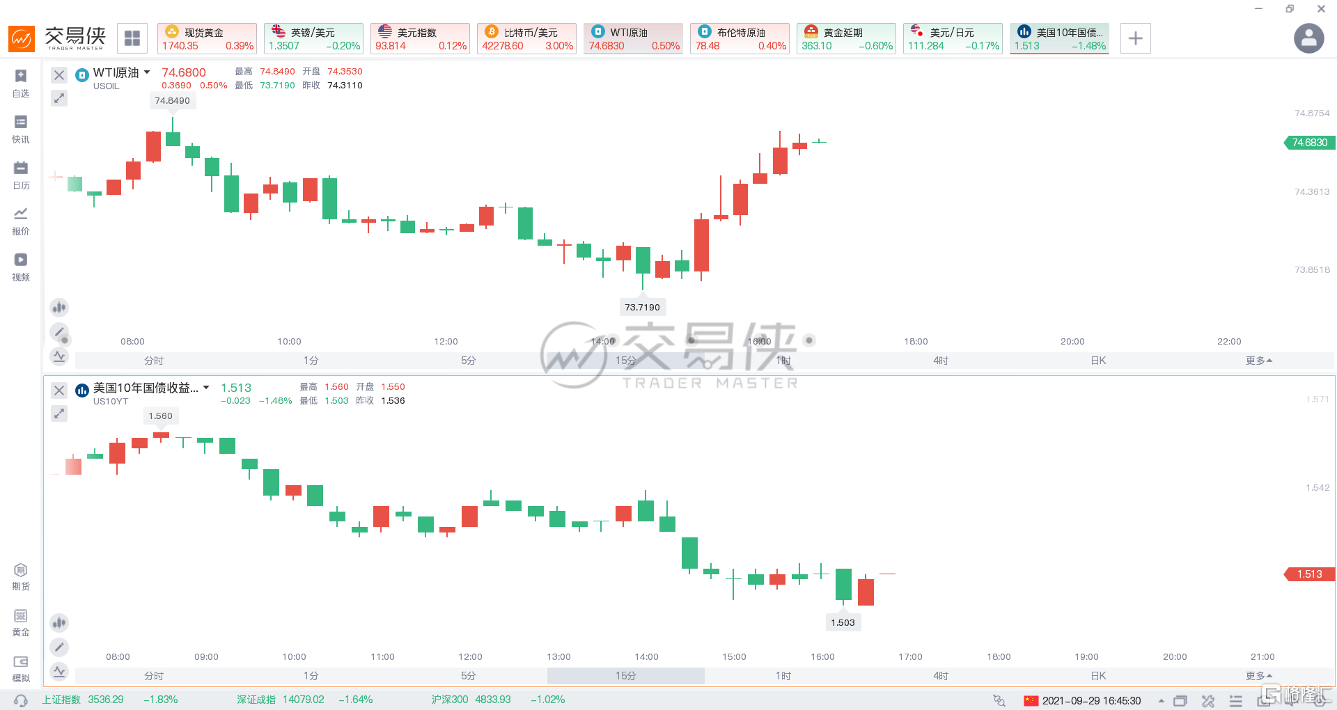 周三,美国至9月24日当周API原油库存意外录得增加412.7万桶,WTI原油期货日内跌幅一度达2%,但随后又强势回升,日内转涨。10年期美债收益率盘中也一度逼近1.5%关口。