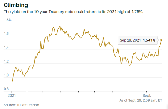 行情数据显示,10年期美国国债收益率在上周低至1.31%,周一已升至 1.5% 的高位。美联储(Federal Reserve)预计将很快缩减债券购买规模,这可能会减少对债券的需求,降低债券价格,提高债券收益率。美联储缩减购债规模和2022年提高短期利率的可能性增大,这些因素目前预计并不会损害经济增长。