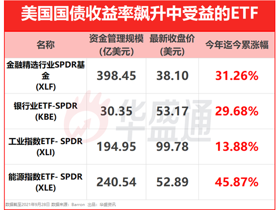 可能从美国国债收益率上涨中受益的股票是那些最具周期性或对短期经济前景敏感的股票,以下是当美国国债收益率飙升时受益较大的ETF: