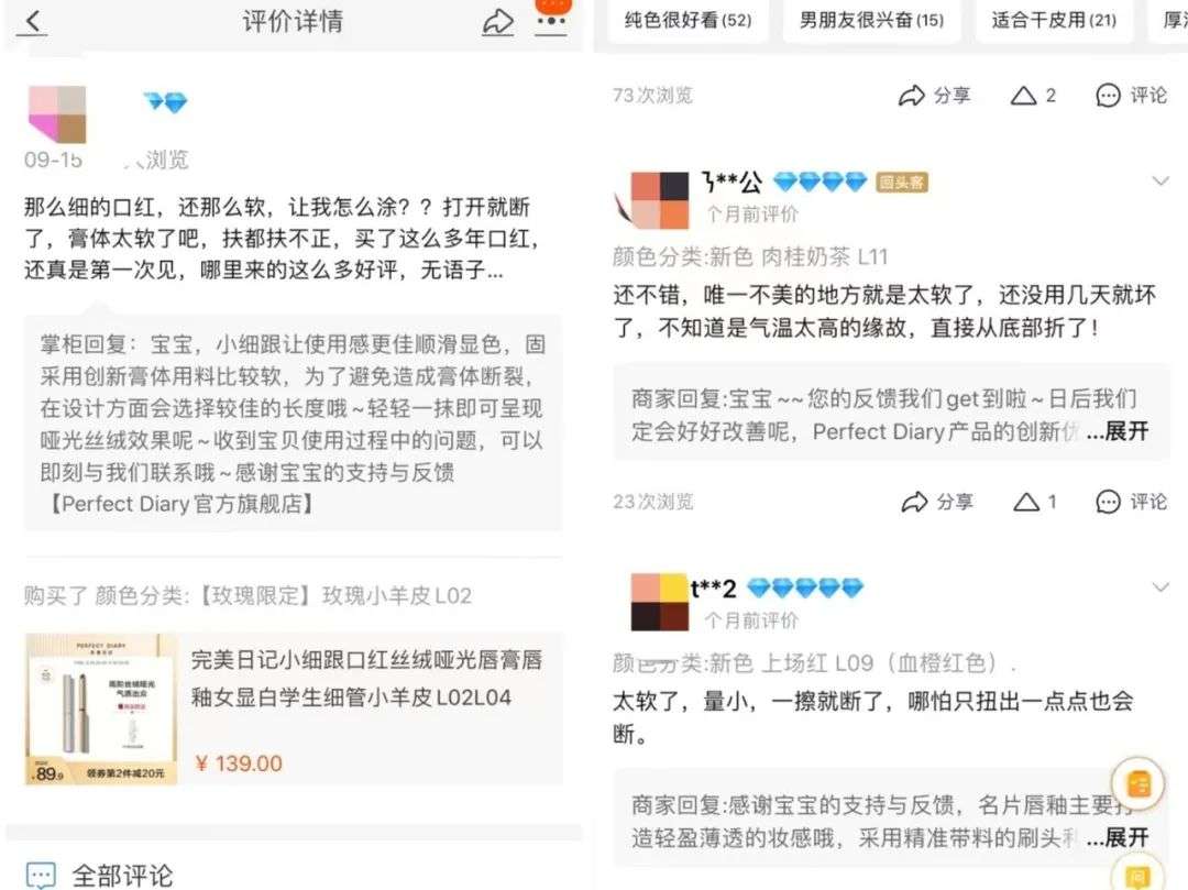 这样的差评和吐槽在各个平台都开始出现。针对小细跟,不少消费者也表示“膏体太软,一擦就断”、“打开就断了,买了这么多年口红,还真是第一次见”……