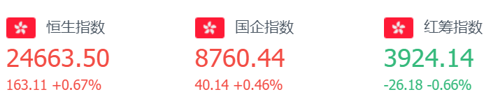 截至周三收盘,恒生指数涨163.11点或0.67%,报24663.5点,全日成交额达1235.28亿。国企指数涨0.46%,报8760.44点,红筹指数跌0.66%,报3924.44点。