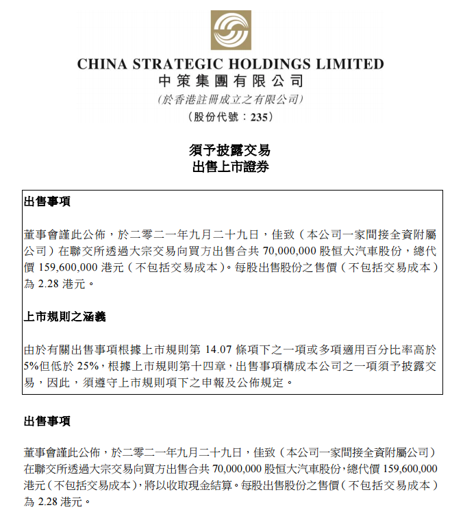 中策集团:出售7000万股恒大汽车股份 总代价1.6亿港元