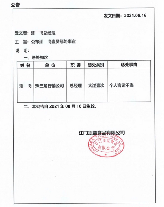 8月16日,公司内部已经公布了对潘某岗的处理结果。一份“公布潘某岗惩处事宜”的内部公告显示,潘某岗因个人言论不当,被记大过一次。