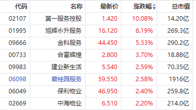 华盛资讯9月30日消息,内地物业管理股上涨,第一服务涨超10%,金科服务涨超5%,旭辉永升服务涨超6%,碧桂园服务涨近3%。