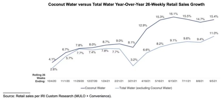 据IRI Custom Research,2020年,椰子水这一品类在MULO+C(Multi Outlet plus Convenience Stores,多种零售渠道和便利店)渠道中的表现一直优于其他品类的饮品。