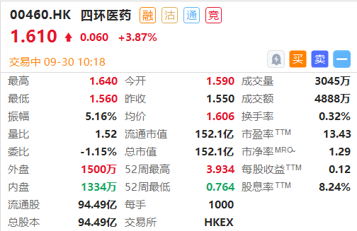 截至发稿,四环医药涨3.87%,报1.61港元,市值为152.1亿港元。