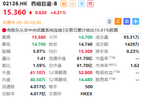 截至发稿,药明巨诺-B涨4.21%,报15.36港元,市值达61.70亿港元。