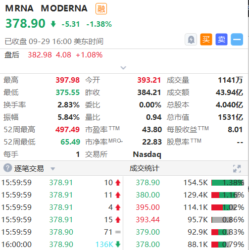 截止收盘,Moderna报收378.9美元,跌幅1.38%,盘后小幅微涨0.42%。