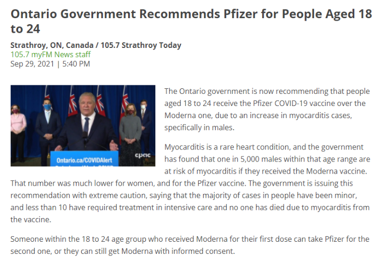 加拿大安大略省首席医疗官基兰·摩尔(Kieran Moore)当地时间9月29日宣布,鉴于Moderna(莫德纳)疫苗在年轻人中引发了多起心肌炎和心包炎的病例,为谨慎起见,决定立即停止为18岁至24岁之间的年轻人接种莫德纳疫苗。这个年龄段的人群接种的第二剂疫苗只能是辉瑞疫苗。