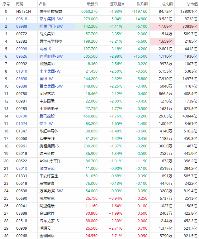 其中,京东跌5.04%,股价报279港元;阿里巴巴跌4.11%;网易跌3.18%;阅文集团、舜宇光学科技、哔哩哔哩、小米等跌3%;腾讯跌1.76%;快手跌1.65%;微盟、平安好医生微跌。