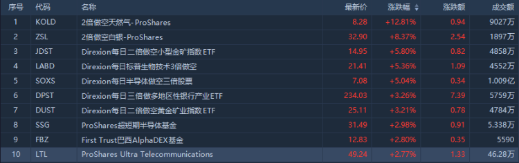 从ETF涨幅榜来看,涨幅居前的是做空类ETF。其中,2倍做空天然气ETF $KOLD 收涨12.81%,成交9027万美元;2倍做空白银ETF $ZSL 收涨8.37%,成交1897万美元;Direxion每日三倍做空半导体股票ETF $SOXS 涨5.04%,成交1.009亿美元。
