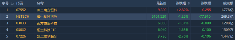 南方两倍做多恒科 $07226.HK 跌2.76%,成交额为1.447亿港元;