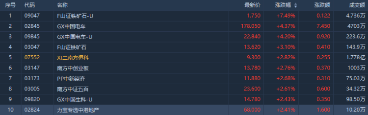 今日港股市场,涨幅居前的是F山证铁矿石-U $09047.HK ,收涨7.49%;GX中国电车 $02845.HK 收涨4.37%;GX中国电车-U $09845.HK 收涨4.20%。