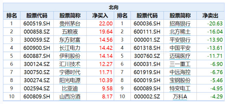 本周北上资金买入金额最多的标的为贵州茅台,一周净买入22亿元,白酒板块还有五粮液获净买入19.64亿元,东方财富获净买入14.56亿元。长江电力、伊利股份等也获港资加仓。