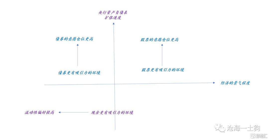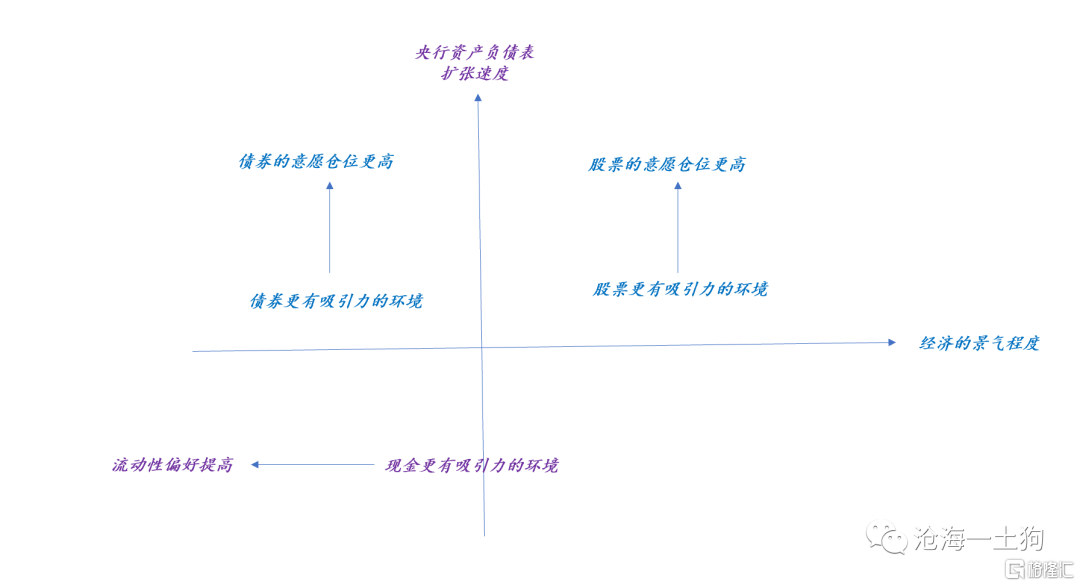 经过这个拓展,资产池变得更加复杂,包括现金、股票和债券三类资产;投资者所面临的的环境也更复杂,包括经济景气度和资产负债表扩张速度两个维度。