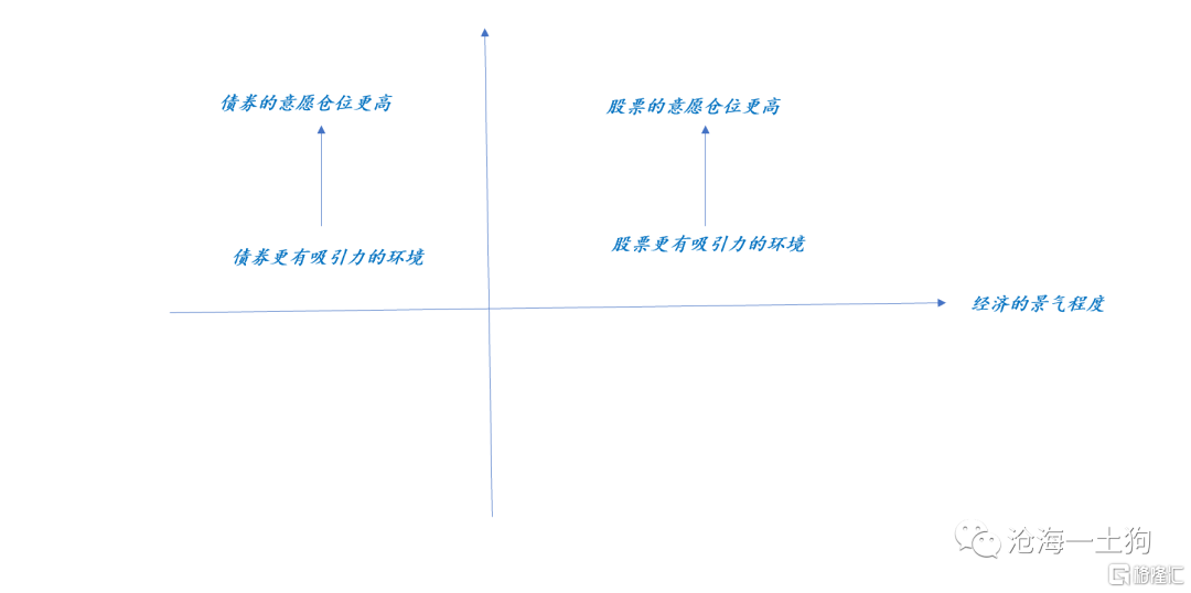 确认好资产特质之后,对偶地,我们就能确认其所适应的环境。债券和股票所适应的环境十分不同:前者适应低景气的环境,后者适应高景气的环境。具体如下图所示,