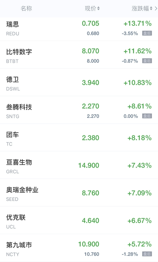 叁腾科技、团车涨超8%,优克联涨超6%,房天下、迅雷涨超2%,新东方、贝壳涨近2%,途牛涨超1%。