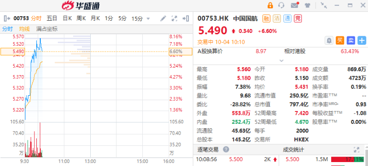 华盛资讯10月4日消息,上周五(1日)美股航空股大涨,今日港股航空股集体走强。中国国航涨近7%,中国东方航空股份涨5.69%,中国南方航空股份涨5.68%,国泰航空涨5.5%,美兰空港涨0.61%。