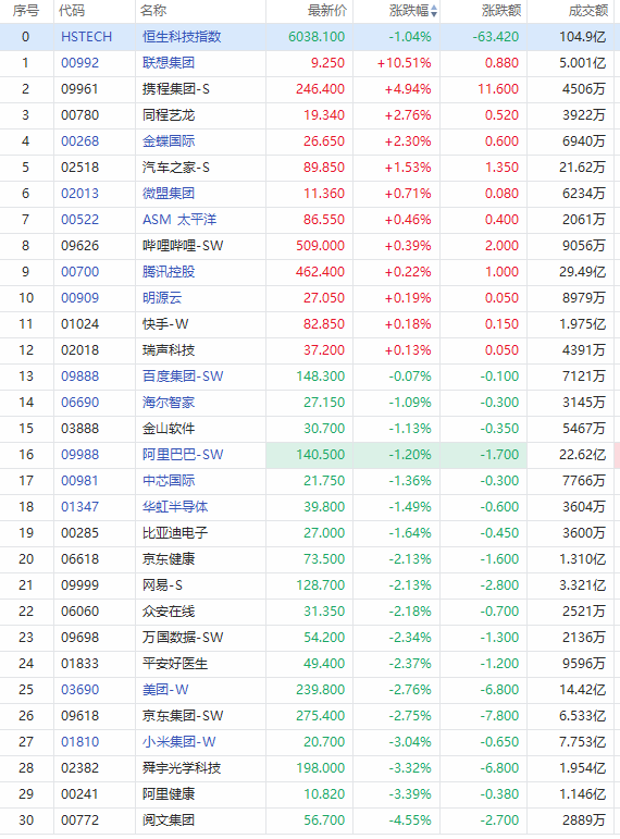 其中,联想集团涨超11%领涨,携程集团涨近5%,同程艺龙、金蝶国际涨超2%。腾讯控股、B站、快手微涨。