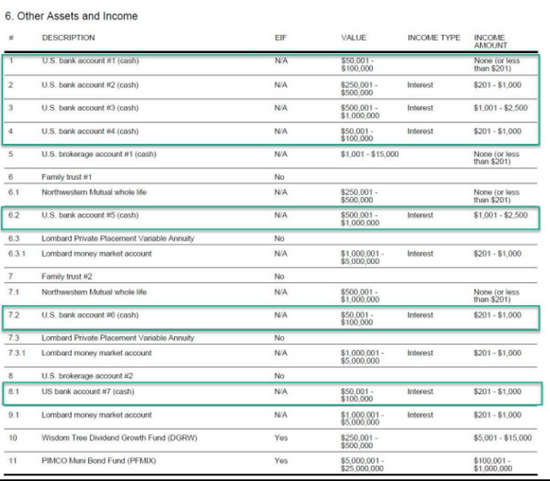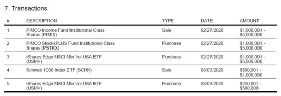 据政府道德办公室的描述,克拉里达在2020年2月27日将太平洋投资管理公司(PIMCO)的债券基金变现,并于同日购买了PIMCO的StocksPlus股票型基金和USMMV ETF。克拉里达在当年进行了五次交易,另外两笔包括在8月3日出售了价值50万至100万美元的Shwab SCHK ETF,并购买了价值25万至50万美元的USMV ETF。