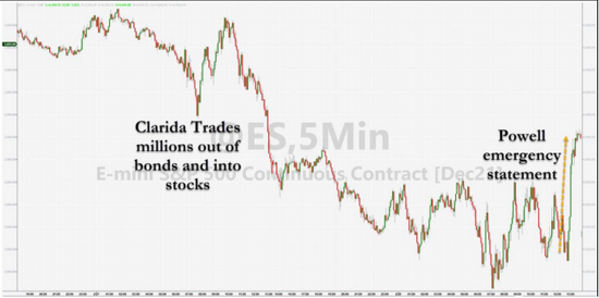 因为克拉里达是在鲍威尔发表紧急声明的前一天做的交易。从下图可以看到,在克拉里达卖出债券基金投入股市后,标普500指数期货一度跌至低位,但在鲍威尔发表声明后的短短几分钟内,标普500指数期货拉升了超过100个基点。