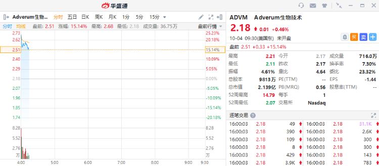 华盛资讯10月4日消息,今日美股盘前,生物技术公司Adverum(ADVM)盘前涨超15%,此前展示其光学疗法数据证明了其基因治疗方法单次体内注射ADVM-022的持续耐用性和安全性。