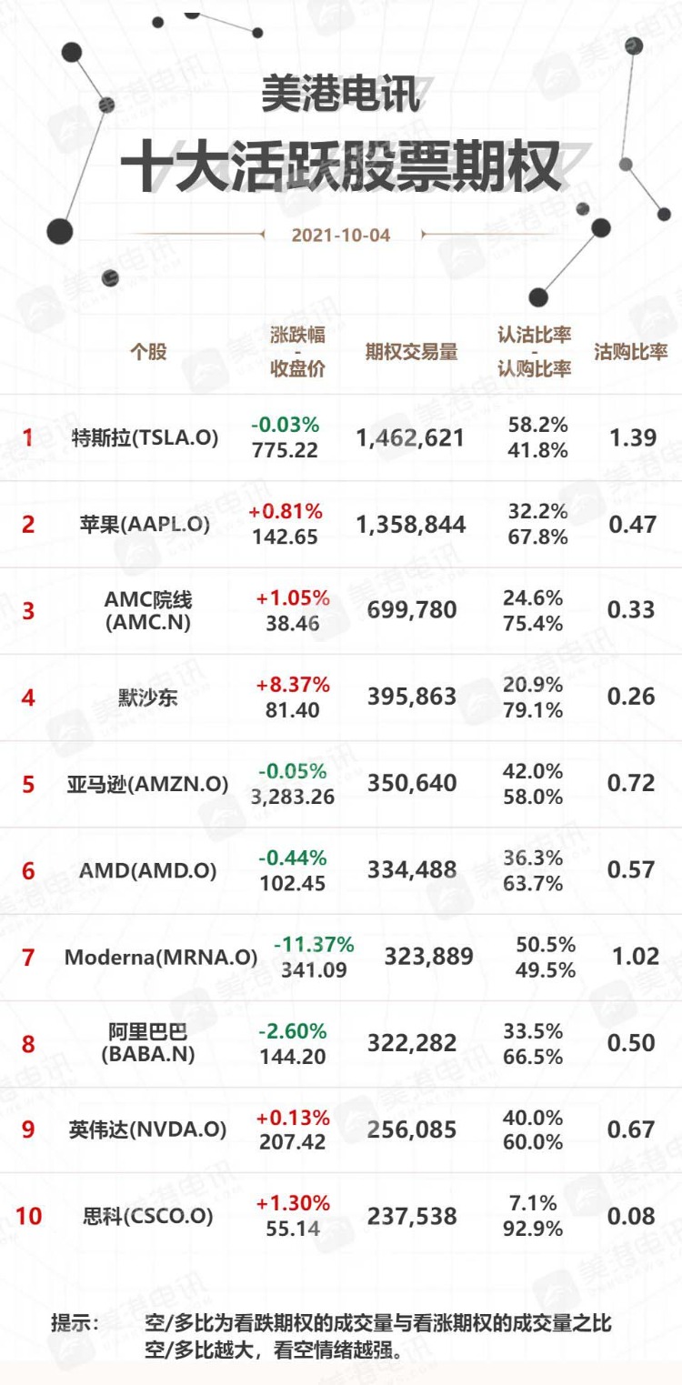 上周五美股十大活跃股票期权如下图所示。特斯拉(TSLA)期权交易量从上一交易日的115.9万张涨至146.3万张,空/多比从1.49降至1.39,看涨情绪增强。