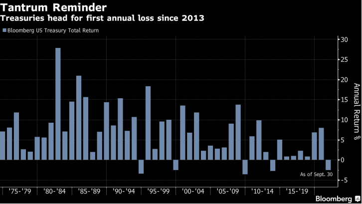 美联储不断渲染缩债预期,以避免2013年的“缩减恐慌”(taper tantrum)。但对美债投资者来说,2021年的情况可能比8年前更糟。美联储政策路径信号的强硬转变引发了最新一轮债券抛售,导致彭博美国国债指数(Bloomberg U.S. Treasury Index)今年下跌2.2%,或是2013年来首现年度下跌。2013年,彭博美国国债指数下跌2.8%。