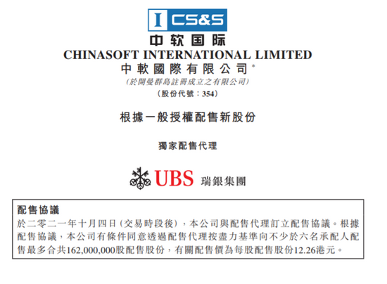 中国软件国际发布配售公告,于二零二一年十月四日(交易时段后),公司与配售代理订立配售协议。根据配售协议,公司有条件同意透过配售代理按尽力基准向不少于六名承配人配售最多合共1.62亿股配售股份,有关配售价为每股配售股份12.26港元,较昨日收市价折让9.85%。