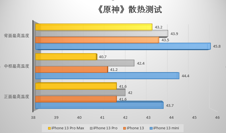 在这些产品里面,机身最大的iPhone 13 Pro Max无疑是散热表现最好的一款产品;同样配备了5核GPU的iPhone 13 Pro因为机身大小和游戏默认设置的原因,散热表现反而不如iPhone 13;最后,受限于产品体积,iPhone 13 mini的散热表现理所应当是最差的。