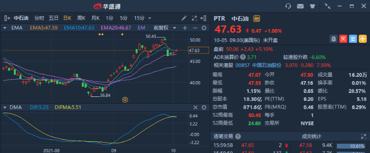 华盛资讯10月5日讯,美股中概股盘前部分走高,截至发稿,中石油(PTR)、农米良品(FAMI)涨超5%,京东(JD)涨近2%,腾讯音乐(TME)涨超1%。