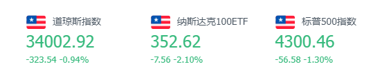 道指跌323.54点,或0.94%,报34002.92点;纳指跌311.21点,或2.14%,报14255.48点;标普500指数跌56.58点,或1.30%,报4300.46点。