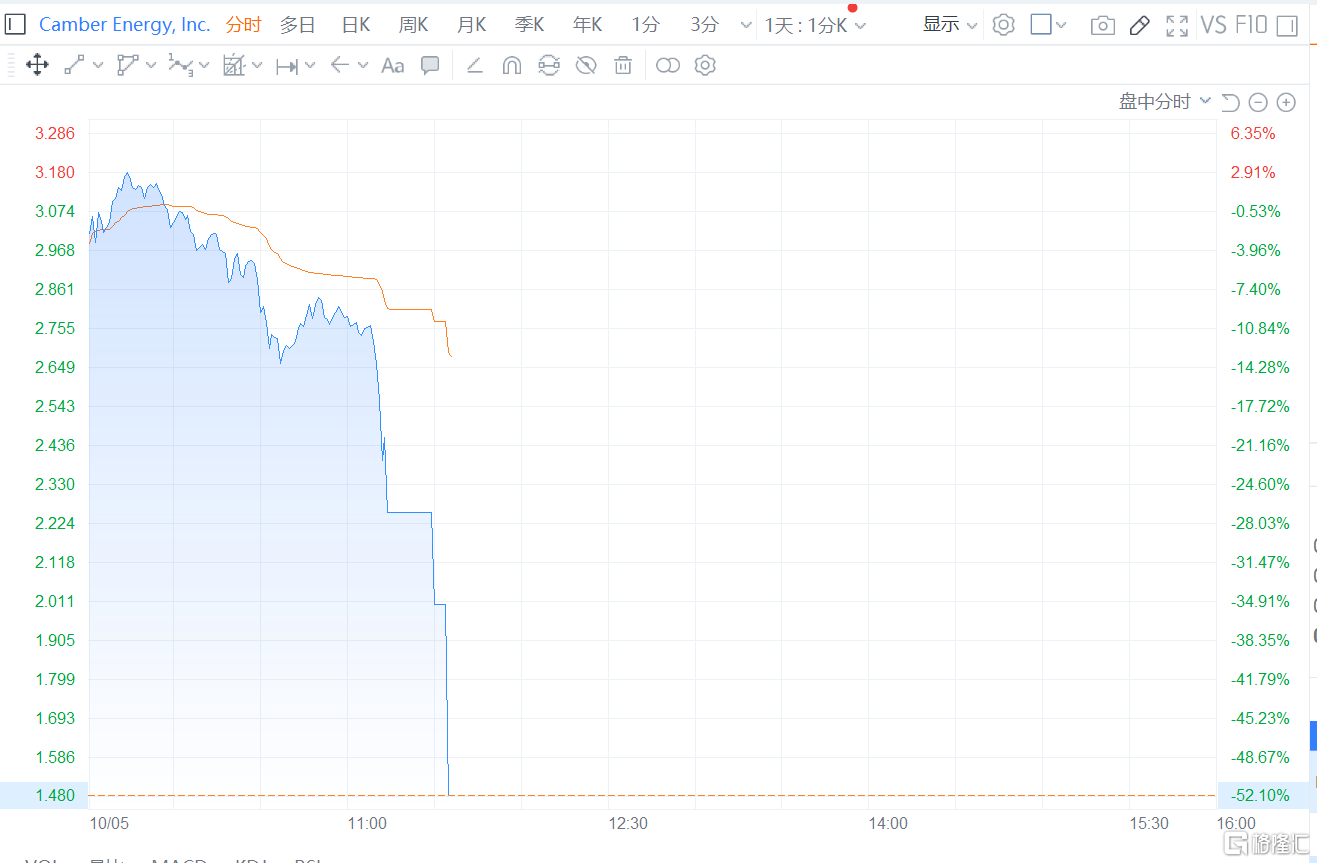 格隆汇10月5日丨天然气公司Camber能源(CEI.US)股价跳水,盘中多次触发临停,现大跌52.1%报1.48美元,暂成交5.74亿美元,最新市值1.54亿美元,换手率高达205.71%。
